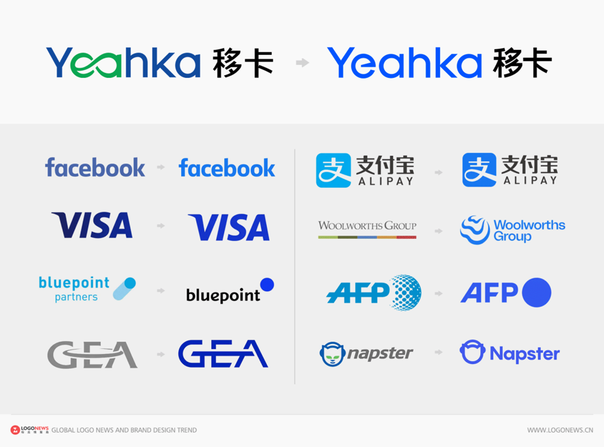 首先,重新設(shè)計的「Yeahka」字體把原先連接在一起的「ea」兩個字母完全獨立分開,并將顏色統(tǒng)一為藍色?;诖罅康膱A形框架調(diào)整筆畫,弱化了鋒利感,使字體?結(jié)構(gòu)??更加清晰,視覺層次更加?分明?。?
