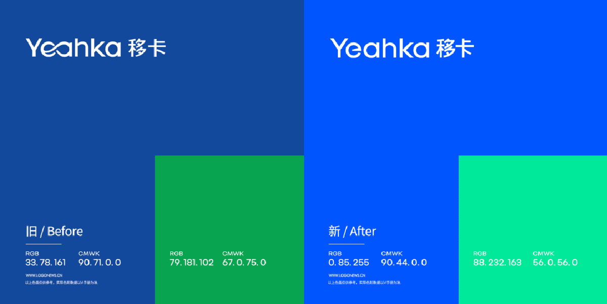 再來看移卡的品牌色更新,無論是核心顏色的「移卡藍」還是用于襯托表現(xiàn)品牌色「移卡綠」,它們的共同特征都是增加飽和度,使顏色在所有傳播接觸點上的對比更強烈,更引人注目。