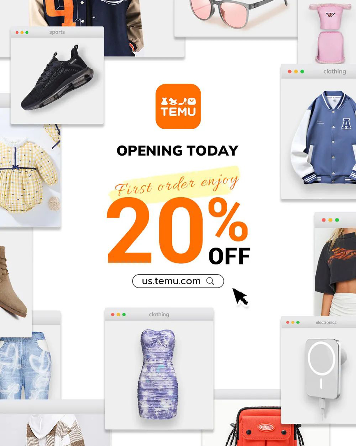 橙色的背景上,除了醒目的「TEMU」文字外,還有裙子、玩具木馬、高跟鞋和箱包icon圖標(biāo)。