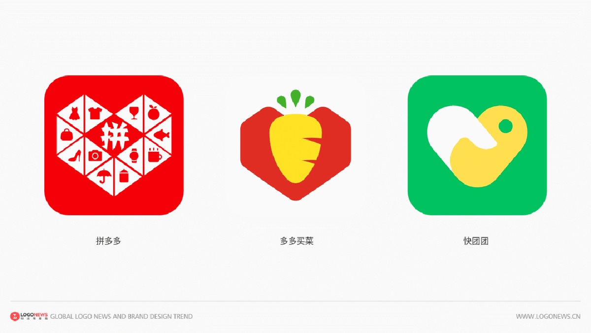 其中「多多買菜」的紅色愛心中心放了一顆黃色的大蘿卜,「快團(tuán)團(tuán)」將握手的概念轉(zhuǎn)化成愛心的輪廓,傳遞合作和互信的概念。
