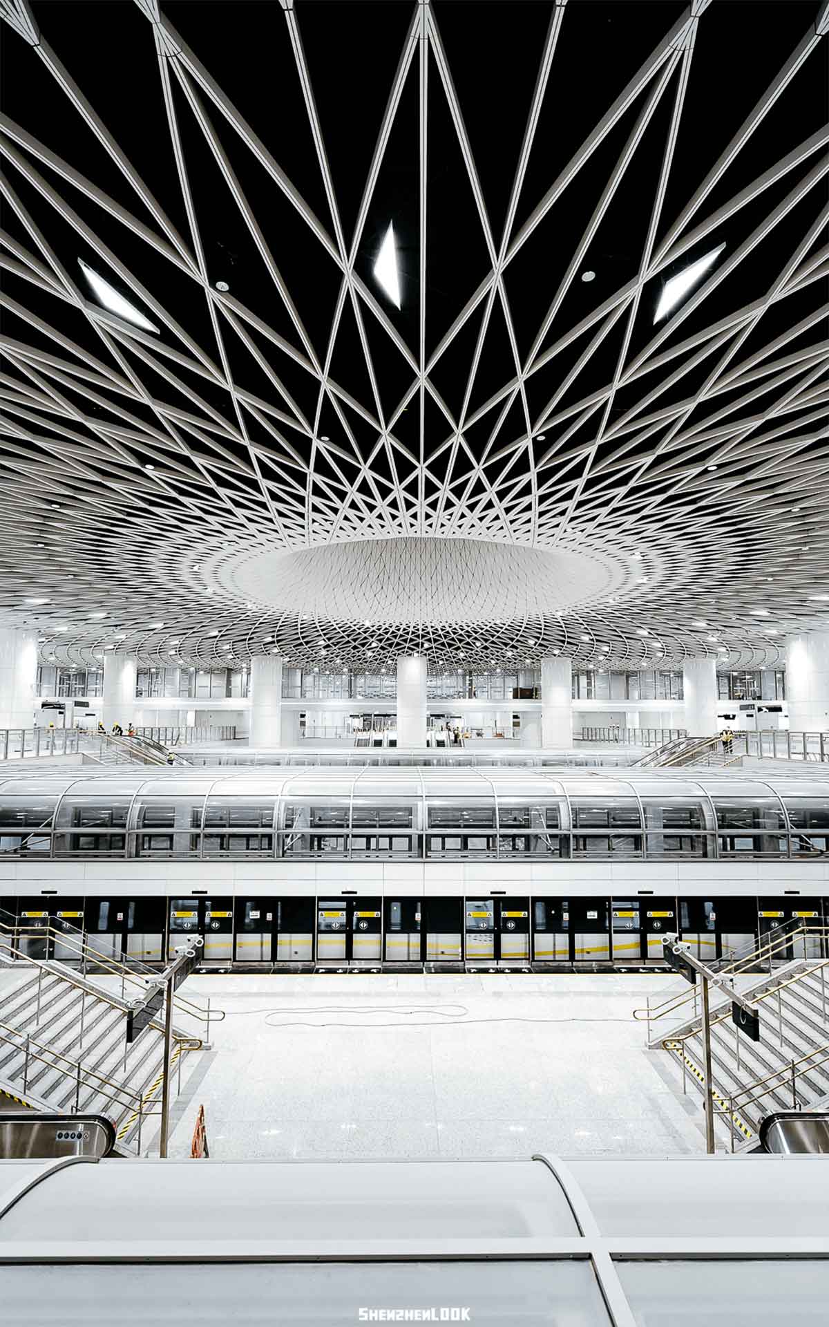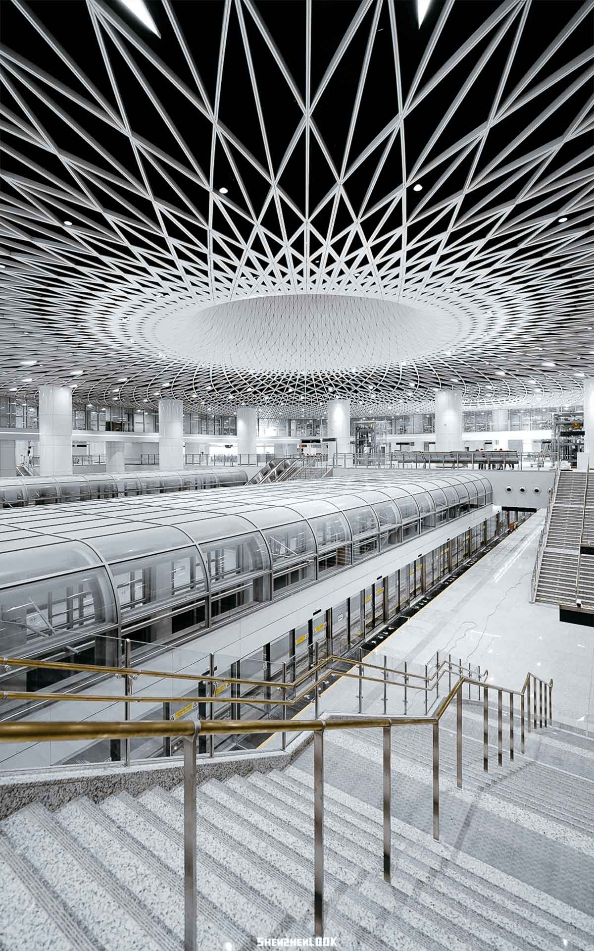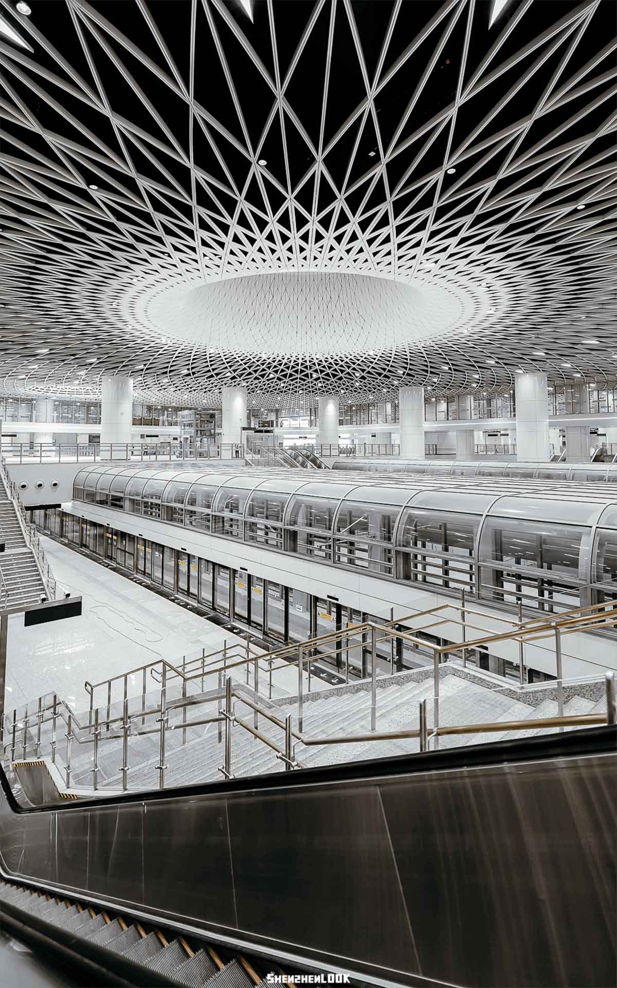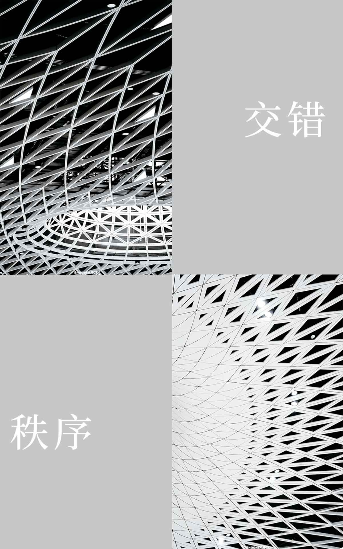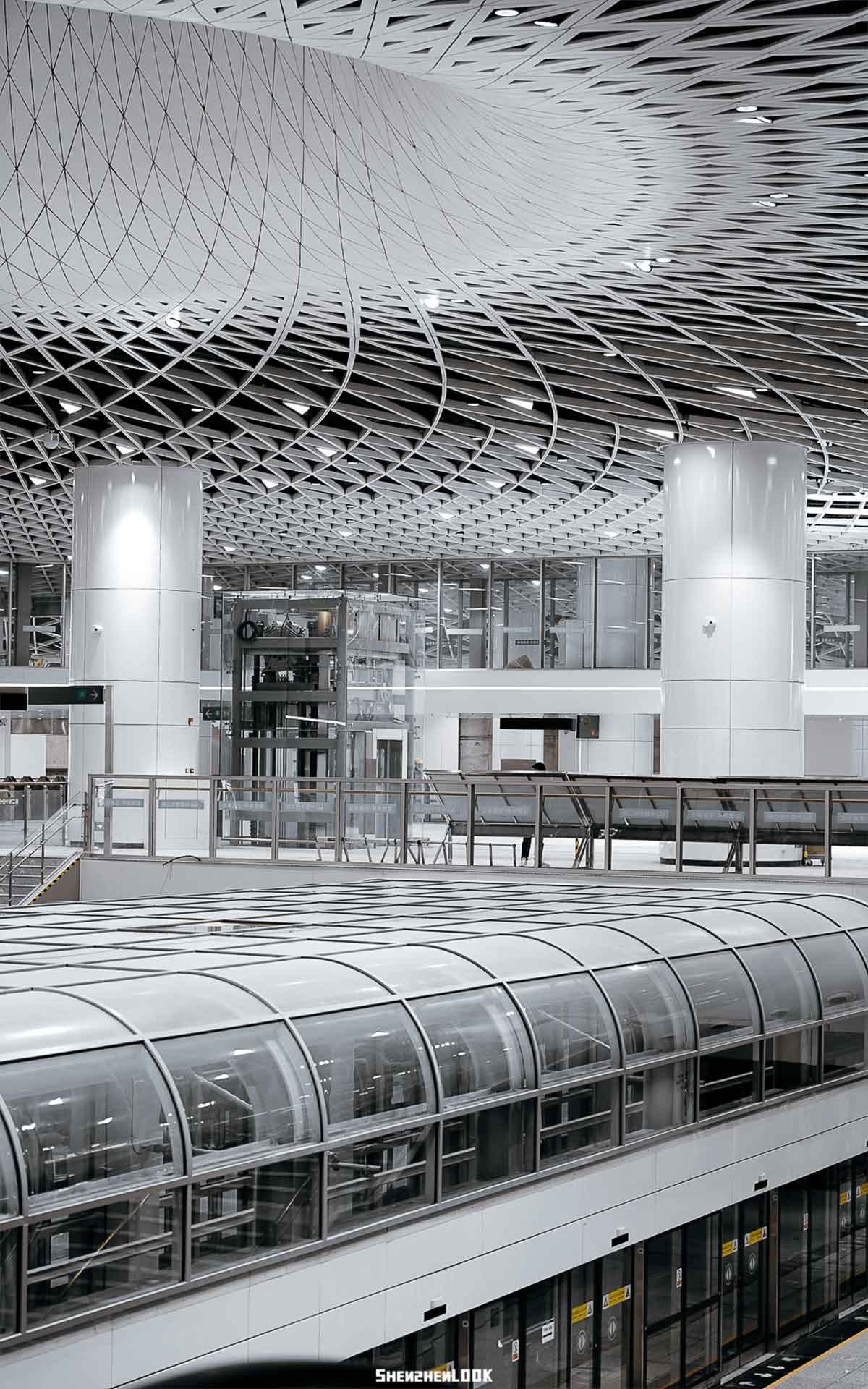 此外,站內(nèi)空間首次實(shí)現(xiàn)了48*51米無柱式空間設(shè)計(jì)。頂部天花螺旋、交錯(cuò)、秩序并存,構(gòu)建出密集的網(wǎng)狀結(jié)構(gòu)。