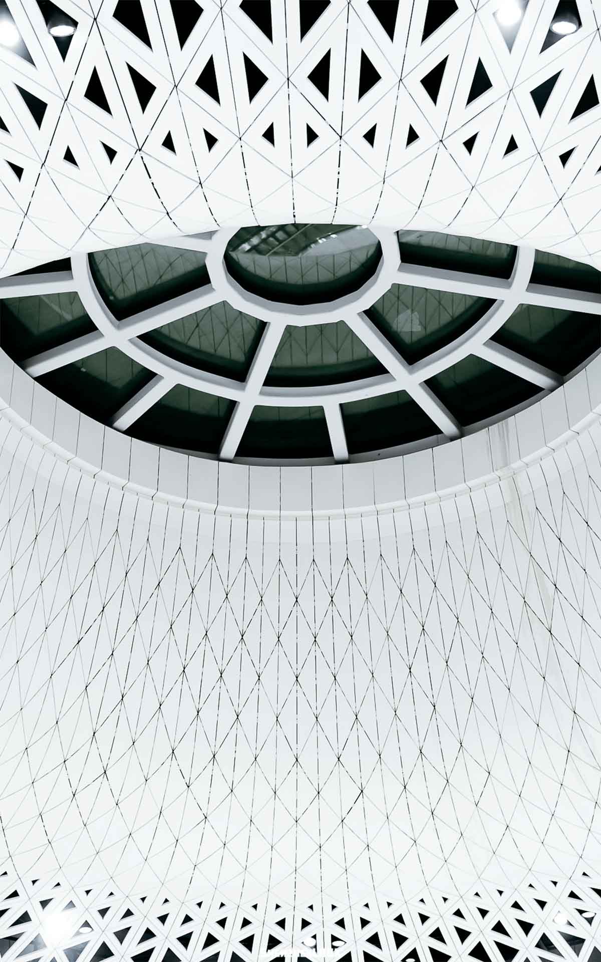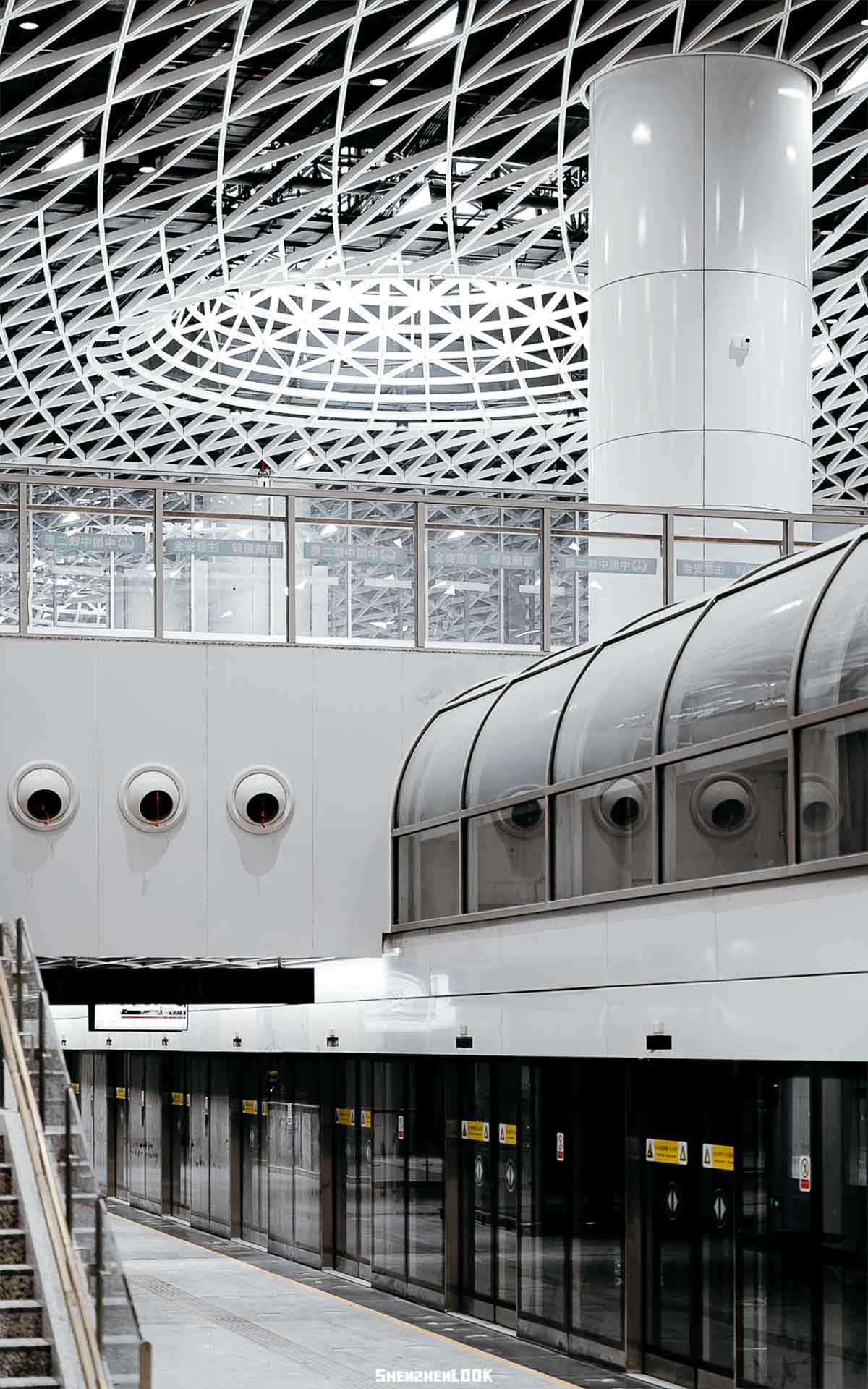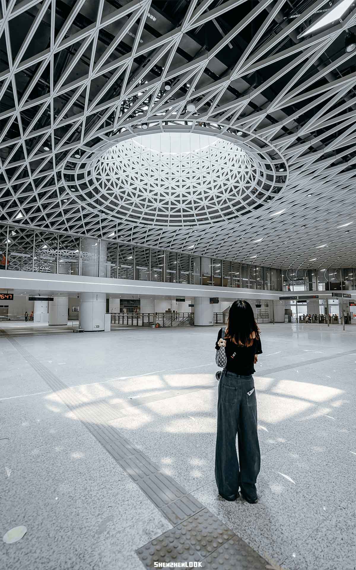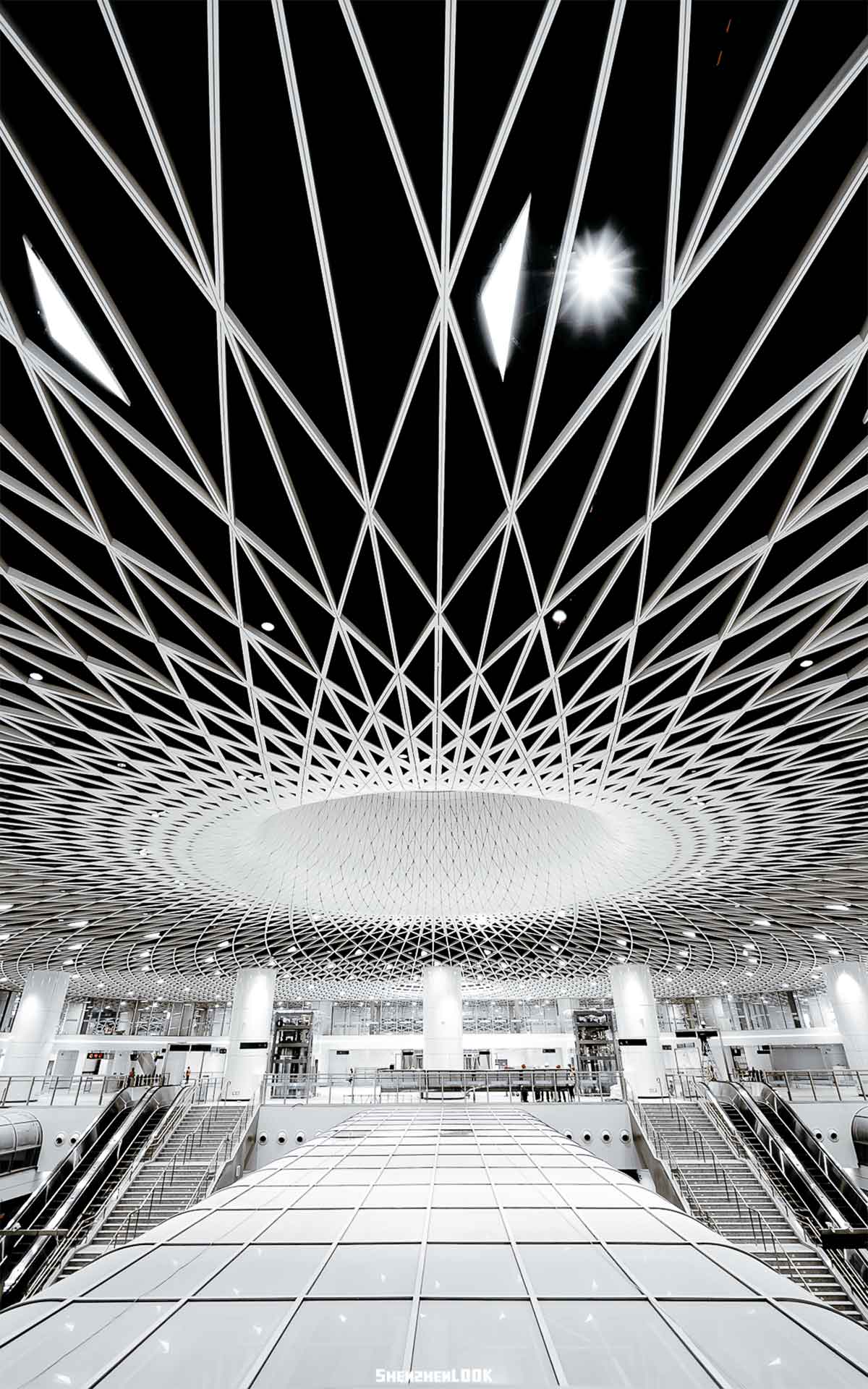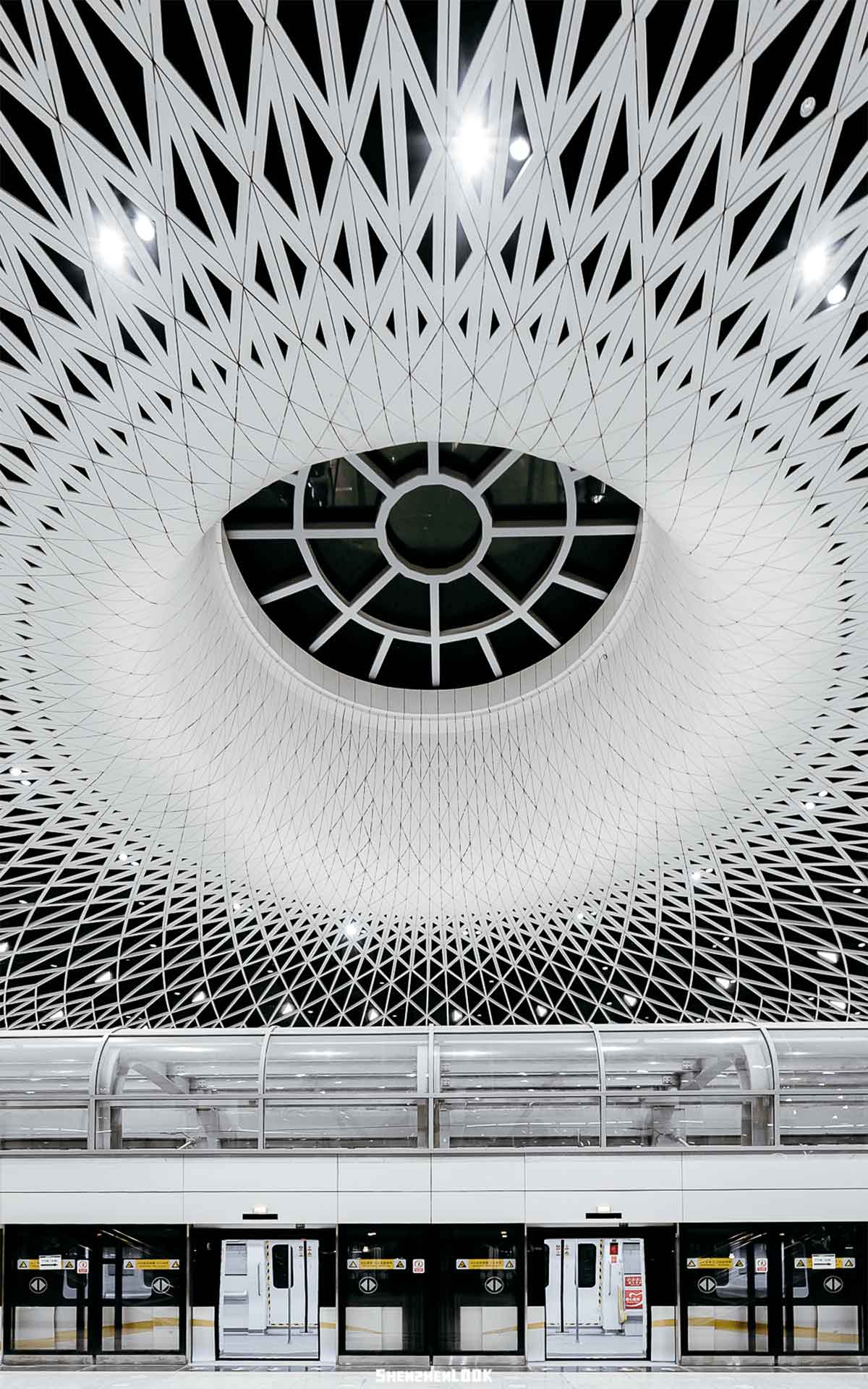 此外,站內(nèi)空間首次實(shí)現(xiàn)了48*51米無柱式空間設(shè)計(jì)。頂部天花螺旋、交錯(cuò)、秩序并存,構(gòu)建出密集的網(wǎng)狀結(jié)構(gòu)。