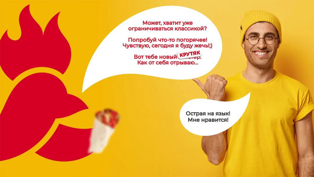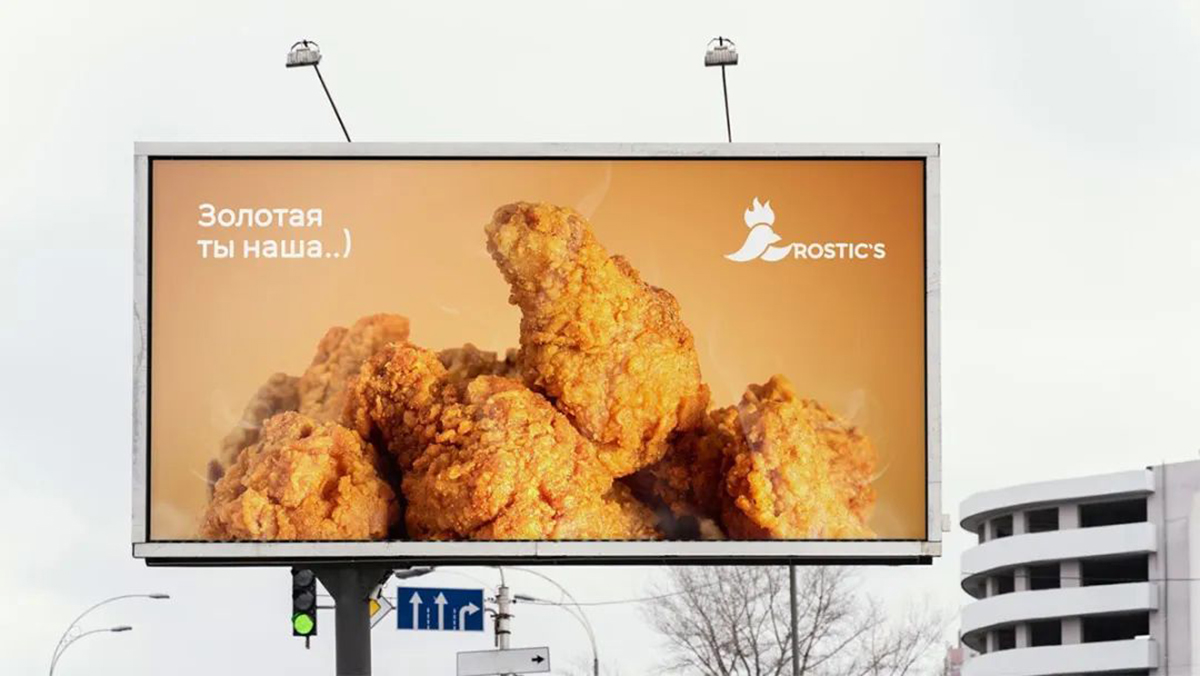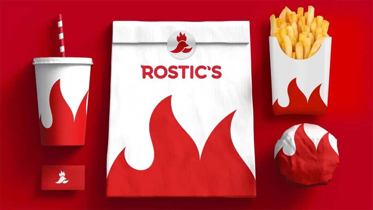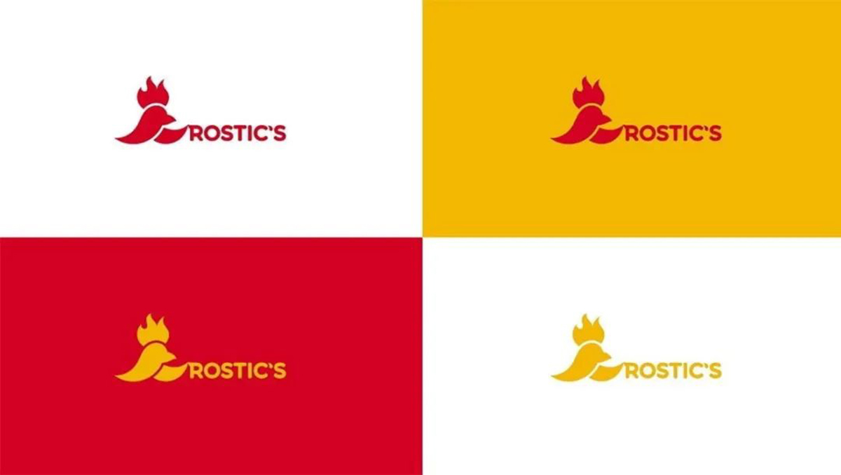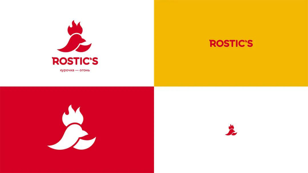 被噴不怎么好看后,這家工作室不甘示弱,又做了一套。這次他以肯德基的新名字 Rostic’s 展開設(shè)計,紅色的大公雞結(jié)合了大寫字母R和火焰(雞冠)的元素,同時還參考了之前消失的俄羅斯快餐連鎖餐廳 Rostic’s 的標(biāo)志設(shè)計,提醒消費者,Rostic’s以一種全新的樣子回來了。