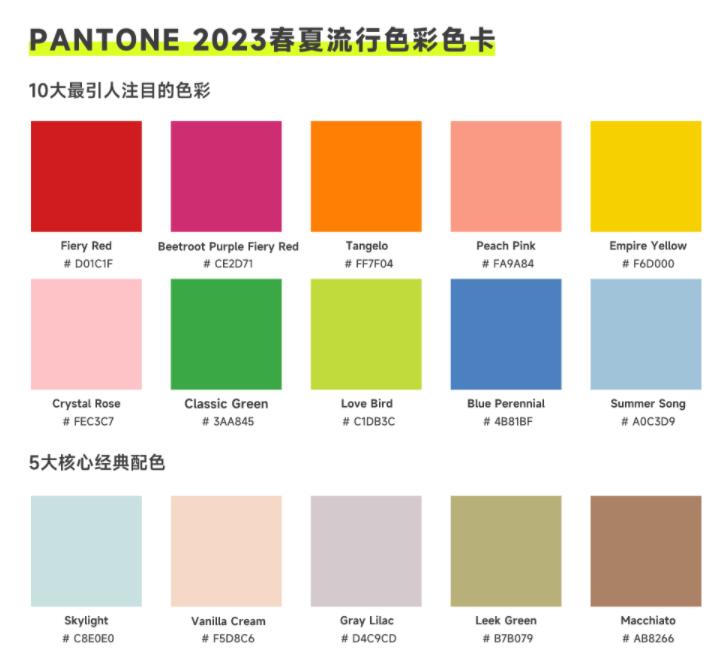 9 月初,國際知名色彩權(quán)威機構(gòu) Pantone 為時尚界發(fā)布了 2023 年春夏色彩趨勢報告,確定了十大最引人注目的顏色,以及適合時裝設(shè)計師推出新作時使用的 5 種經(jīng)典色彩。